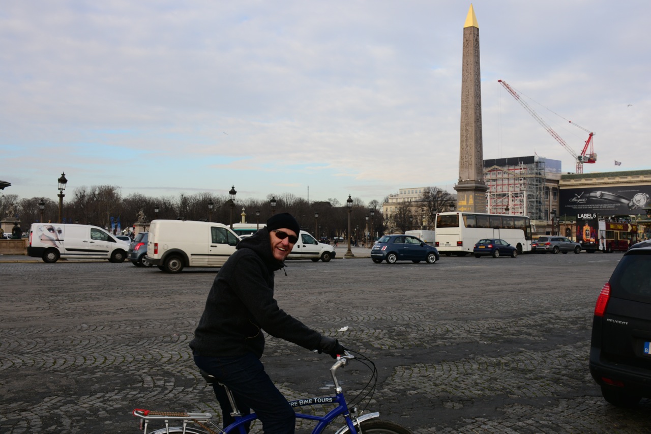Being on a bike in Paris, leads to only one desire for me…. to round the Place de la Concorde and sprint up the Champs Elysees to victory. My dreams have been realized, albeit on a fat tired cruiser clothed in black rather than in yellow, although I didn’t get far up the Champs Elysee owing to the Christmas markets blocking the way.