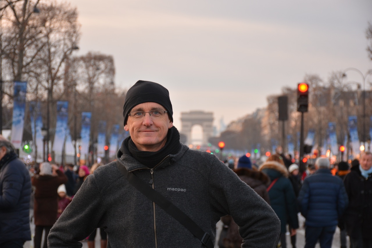 Afterwards, we strolled up the Champs Elysees, still closed to traffic for New Year’s Day, to the Arc de Triomphe. Thousands were still out, but the sun was setting and the lights came on as we strolled up the pave of the Champs, walking in the paths (tyre prints) of many Le Tour champions. Paris, City of Light.