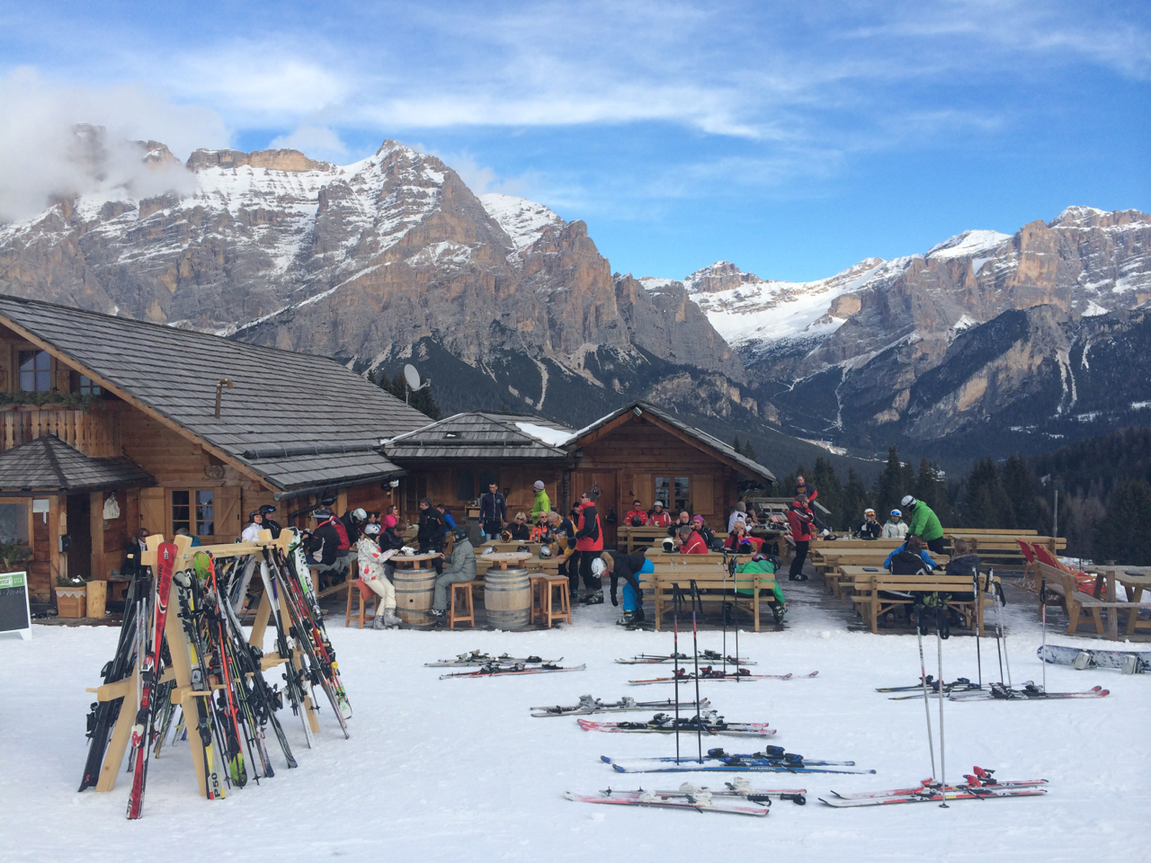 One of the joys of skiing from San Cassiano was stopping at the mountain huts and chalets for morning tea or lunch. On a sunny day we loved skiing up to a hut, taking a table outside on the deck and enjoying a cracking cappucino or snack. After some more skiing we stopped at another hut for late lunch of pasta or minestrone before tackling a few runs on the way back home.
