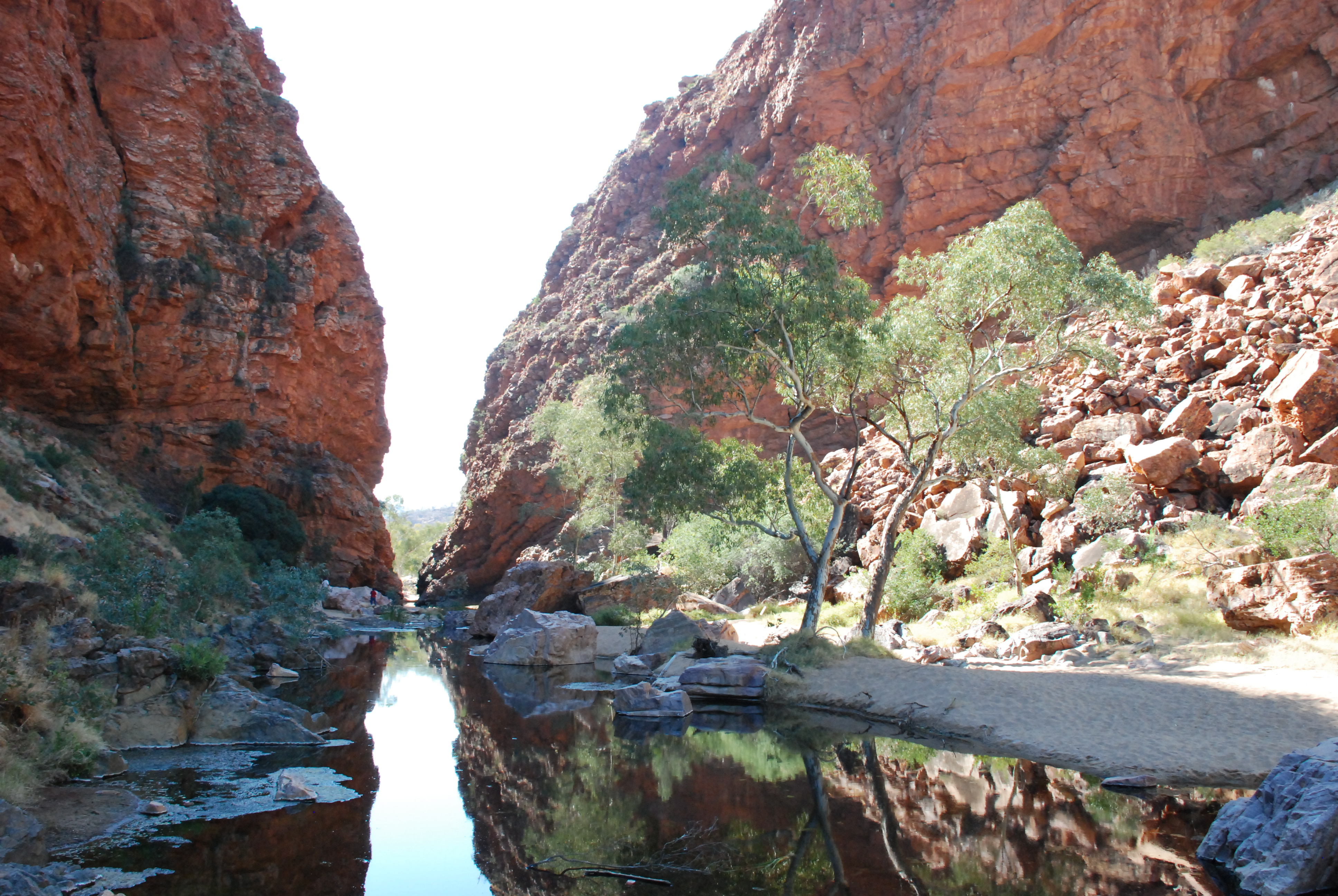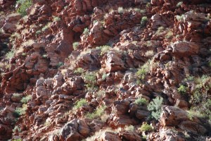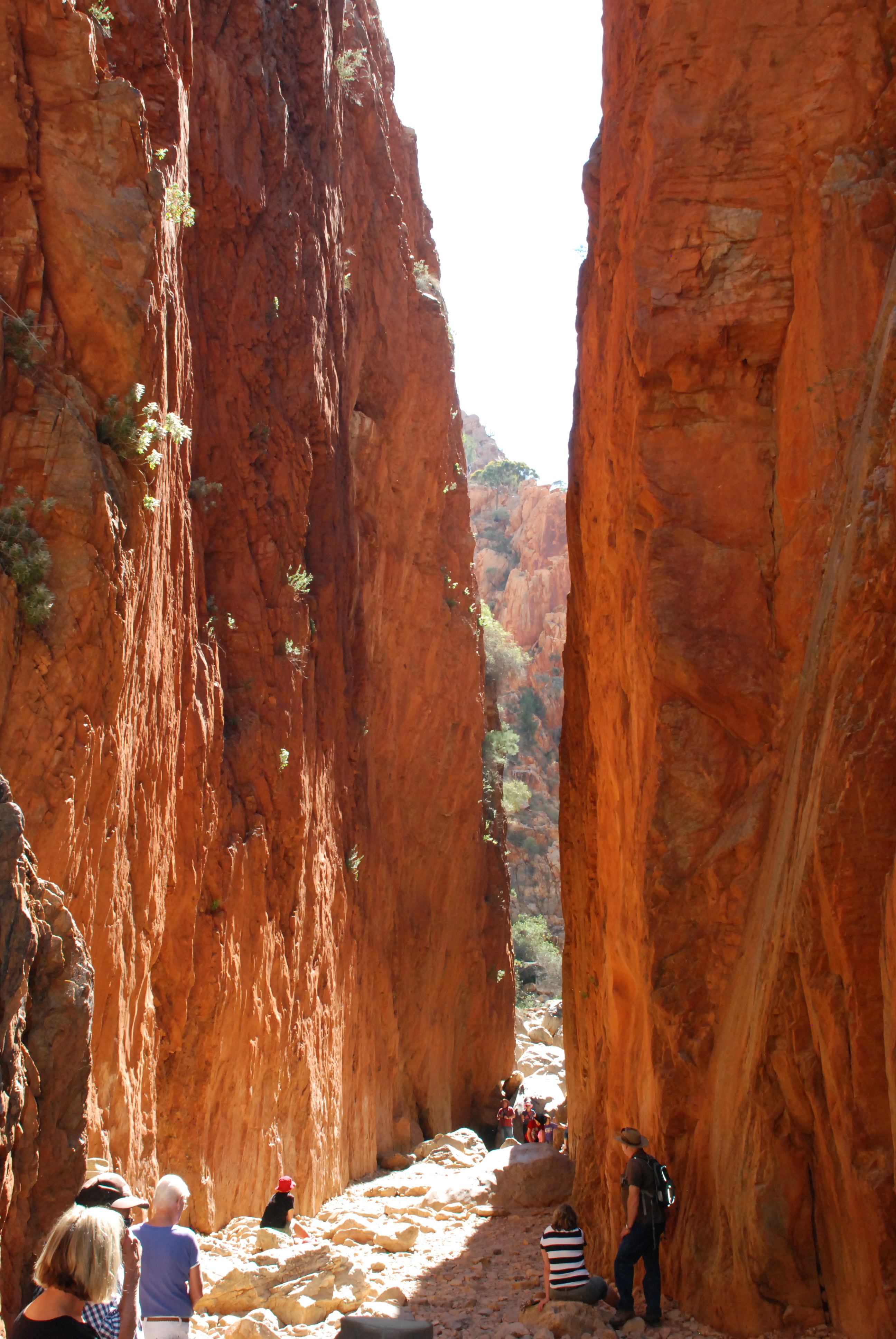 Standley’s Chasm is a cleavage in the rock walls of the ranges about 5m wide. From top to bottom – about 30m – maybe. If you get there in the middle of the day and walk for 1.5k along a rocky (dry) creek bed, you are rewarded with a beautiful view of the sun shining directly into the chasm and making the red walls glow a fiery colour. The floor was sandy, and we suspected erosion! So we sat and had lunch with the 75 other people who had decided to check it out at midday… Must get off the beaten track.