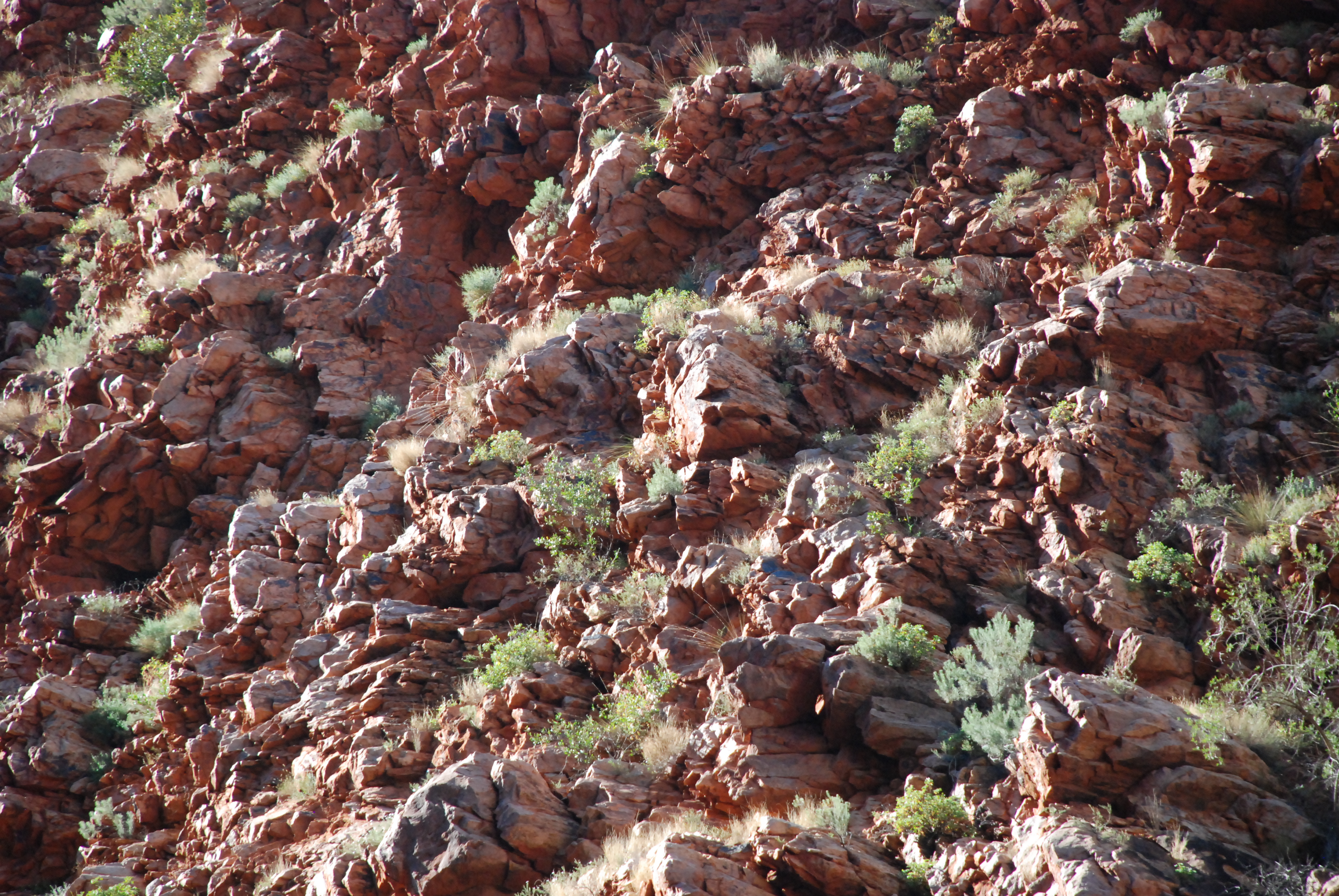 A perfect family picnic spot, the rocks from a recent landslide (ie this century) provide a playground for Black footed Rock Wallabies. Lots of signs saying “Do Not Climb the Rocks”, and we were thus surprised, as we tried to keep quiet and make no sudden movements, to see two bikini clad teenage girls rise up from the natural habitat of the endangered Wallaby and stroll back down the carpark!