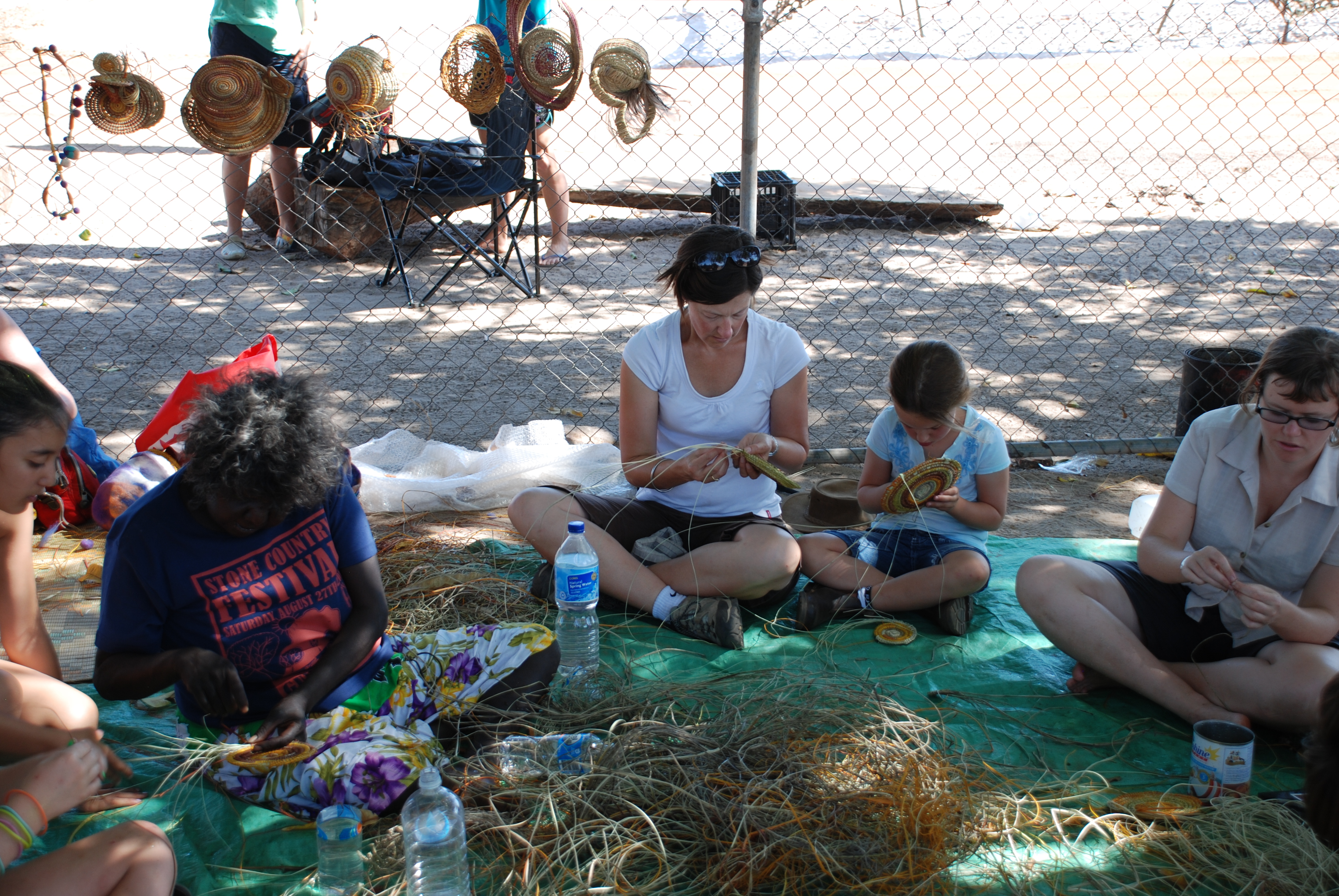 We parked next to the Gunbalanya oval. It was 37 degrees and 2pm. We navigated our way through town to the art centre “Injalak.” Local artists paint and exhibit their work there. There were canvases, designs on paper, didgeredoos, weaving and the only air conditioning unit in town. Afterwards Eleanor and I headed for the trees outside where, if you sat down near the women, they would teach you to weave pandanus. We both made a little progress on some baskets begun by others. It was clearly a community weaving project, as it takes a long time to do. I am happy to report that it involved mainly blanket stitch!.
