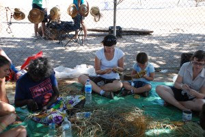 A little weaving - using pandanus and needles. A sharpened wallaby bone was used before they had needles.