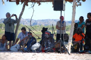 Later, on the specially prepared sandy stage, a dancing festival was held. We sat under camouflage netting and Axo1000 and BloggiE saw their first Aboriginal dancing. And what a setting! The escarpment and floodplains was the backdrop for the dancers and the band played under thatched huts. It was hard to go past it.