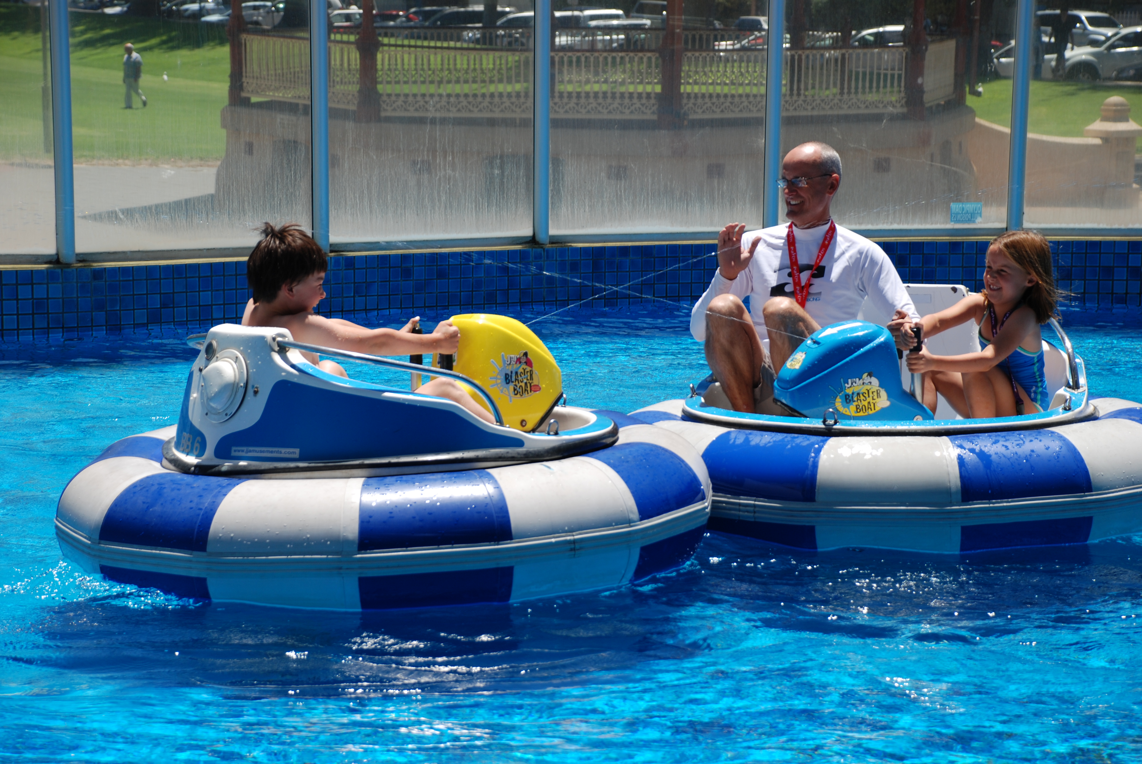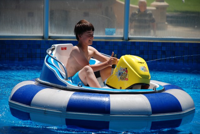 Next up…the Bumper boats. A bit like the cars but in water. Did I mention the uber-techy water jet built in to the steering engine?