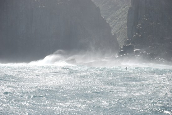 It was so windy, rough and wet that the spray on the water flew off the rocks.